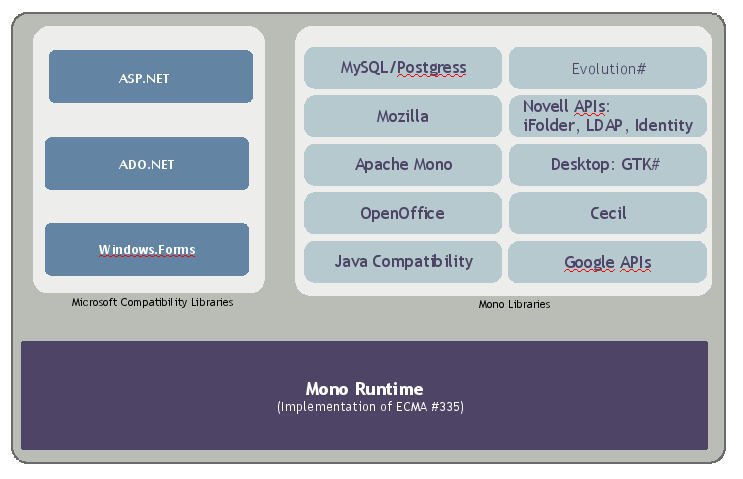 Mono 是 .NET 框架和 ECMA-334 (C# 语言) 和 ECMA-335 标准 (CLI 虚拟执行系统) 的一个开源实现。