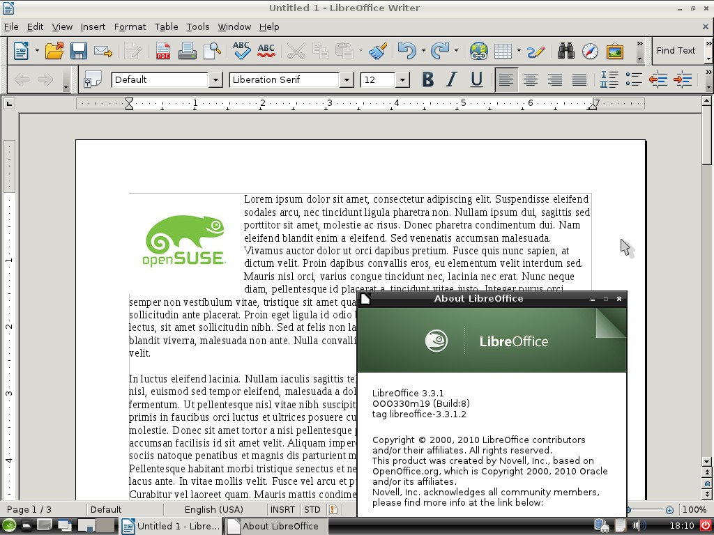 openSUSE 是首个在稳定版本中发布 LibreOffice 3.3.1 的主要 Linux 发行版,这部分归功于 openSUSE 开发者在 LibreOffice 社区中的大力参与。首次 LibreOffice 版本引入了在 Draw 中导入和编辑 SVG 文件的能力、对 Calc 中最多 100 万行数据的支持,以及使 Impress 中的幻灯片布局处理更加容易。LibreOffice 代码库也进行了大量清理,提高了稳定性和启动性能。对于有兴趣在 LibreOffice 上工作的开发人员,openSUSE 提供了独特的“拆分构建”开发包,使其更容易开始在 LibreOffice 上进行黑客攻击。