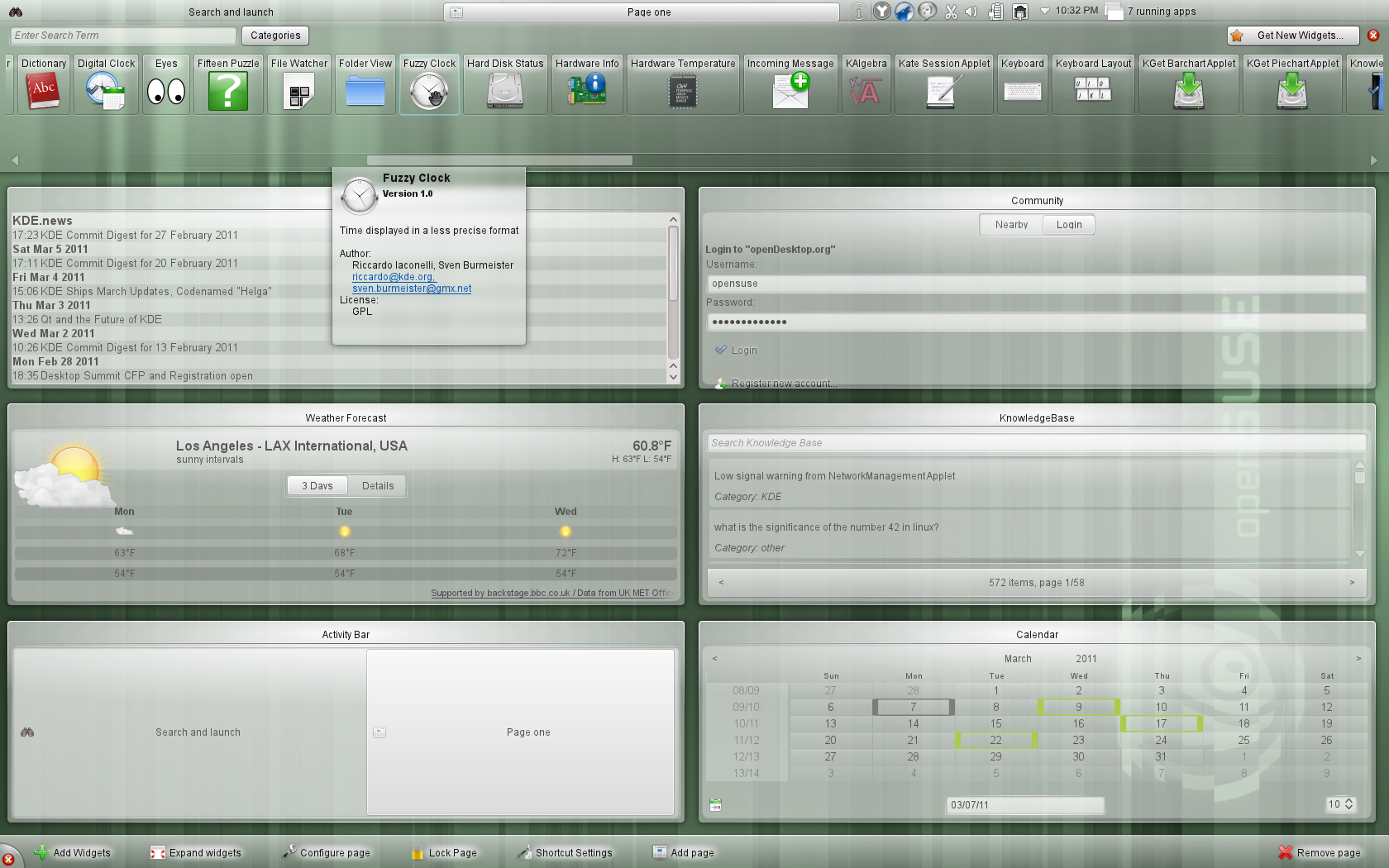 默认的 openSUSE 桌面,KDE® Plasma 桌面,引入了更轻松的活动管理、更好的性能以及对电池、网络和蓝牙处理的可用性和功能改进。Workspace 应用程序带来了 Dolphin 中的新分面搜索,以及 Gwenview 和其他应用程序中易于访问的社交共享插件,如 Flickr、Facebook 和 Picasaweb。