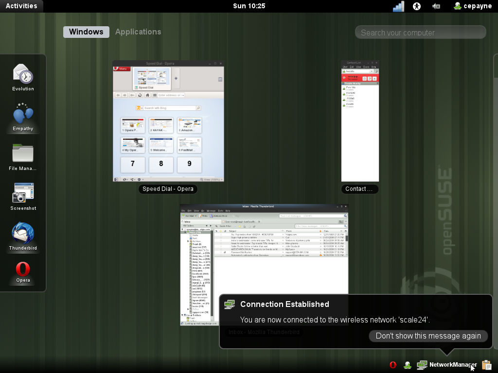 最新版本 2.x 系列,GNOME® 2.32 在 openSUSE 11.4 中为您带来 Time Tracker,也称为 Project Hamster,以及 Empathy 功能,如元联系人和快速搜索。Evolution 变得更快,Banshee 支持 MusicBrainz 元数据获取和更多便携式音乐设备。openSUSE 还提供了即将推出的 GNOME® 3 和 GNOME® Shell 的快照,它为您的计算机带来了更加流畅和直观的工作流程,集成了消息传递和窗口平铺。