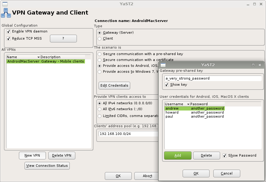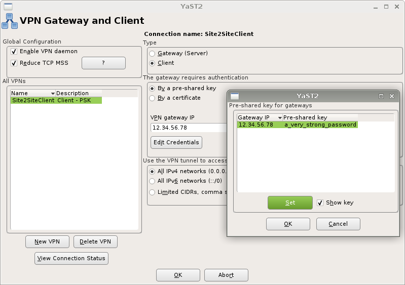 YaST 模块将处理所有网关和客户端场景的 /etc/ipsec.conf 和 /etc/ipsec.secrets。但是,IPSec 有大量的可能性,YaST VPN 模块并不理解所有这些可能性,因此,请避免手动更改 /etc/ipsec.conf 和 /etc/ipsec.secrets,否则您的自定义设置可能会在您下次使用 YaST VPN 模块时被删除。