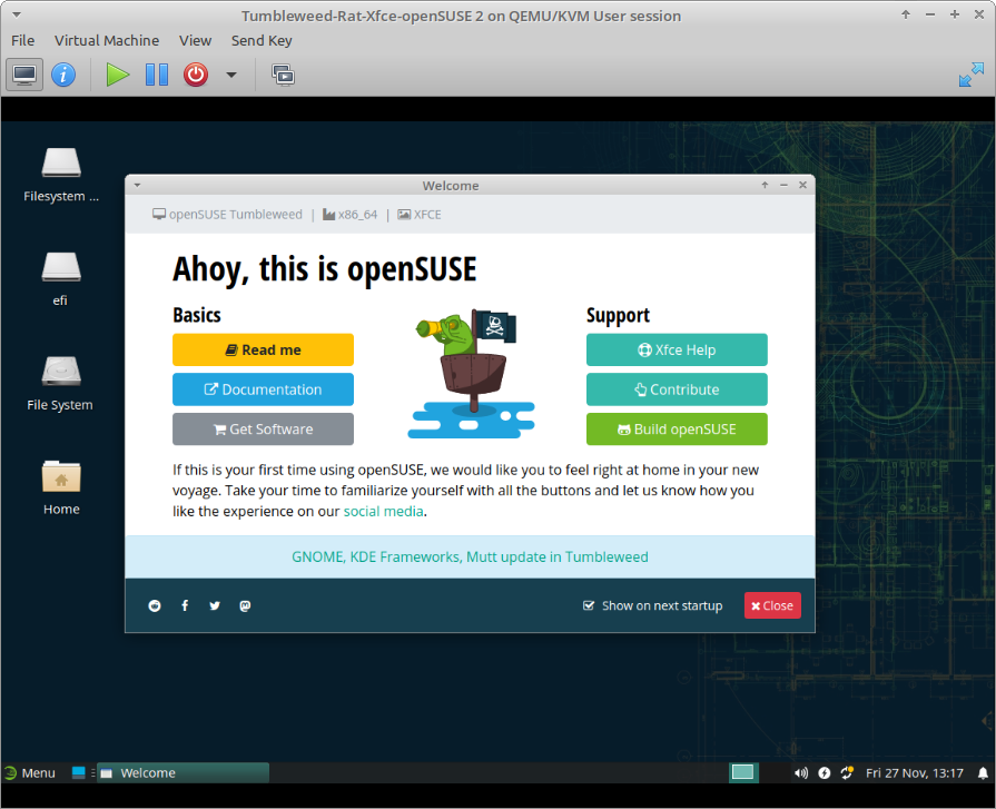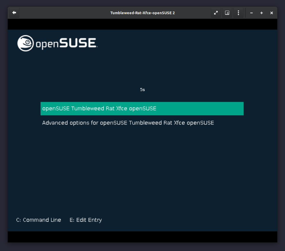 - “vanilla”磁盘镜像提供了完全未修改的来自 Git 源代码的 Xfce,没有任何 openSUSE 的视觉调整。这为 Xfce 开发者(以及测试人员)提供了在完整的 Xfce 环境中构建和测试软件的最便捷方式。