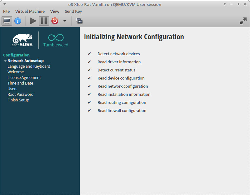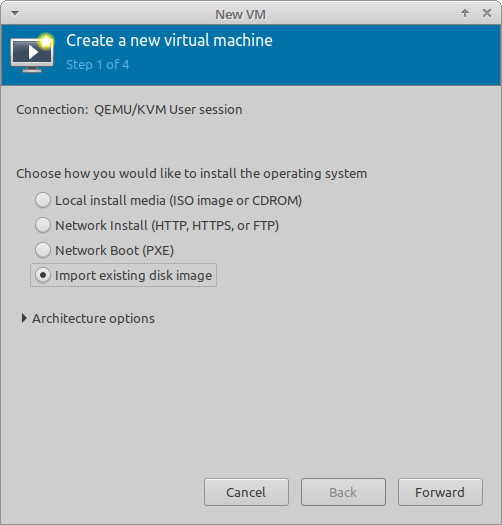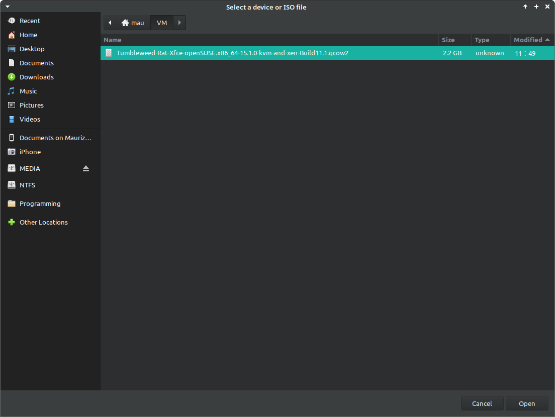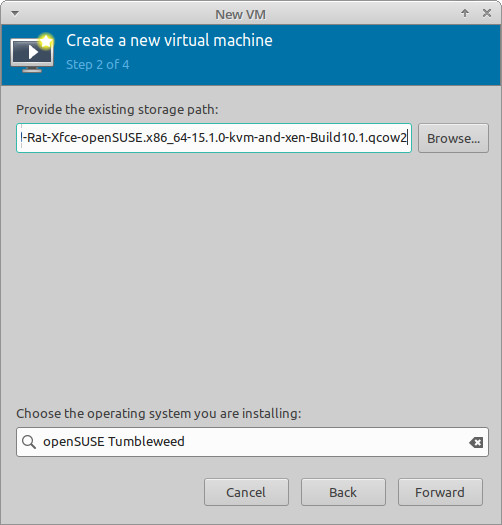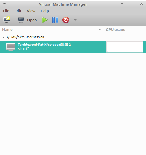 一个功能更丰富的工具,用于加载 qcow2 镜像以及通常的 QEMU/KVM 虚拟机是 virt-manager。它主要针对 KVM 虚拟机,但也适用于 Xen 和 LXC。Virt Manager 允许您设置和控制在底层设置,这些设置通常在 gnome-boxes 中自动执行,从而为用户提供了对 设置的更多控制。请在他们的 网站上了解更多信息,或立即从 openSUSE 的标准仓库安装它。