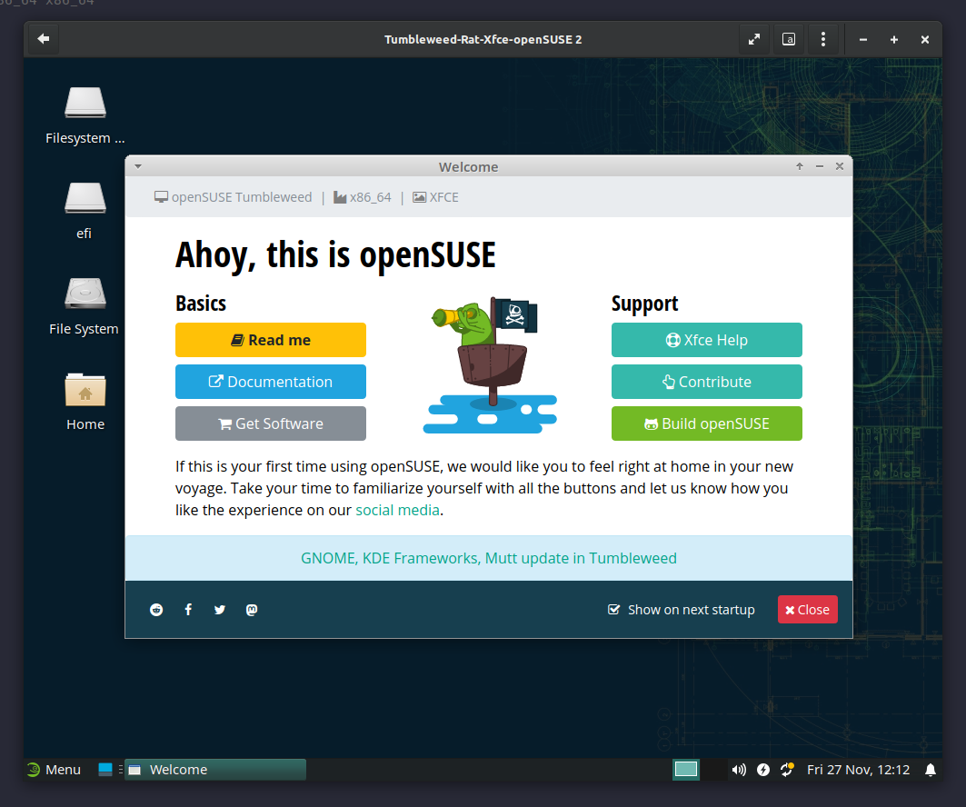 此页面旨在为 Xfce 开发者和希望测试和预览来自 GIT Master 分支的最新 Xfce 构建的用户提供指南。这些镜像基于 openSUSE Xfce RAT,这是我们的 Xfce 开发 OBS 仓库,用于 Tumbleweed。 构建过程完全自动化,并定期发生,为用户提供基于 openSUSE 滚动发布 Tumbleweed 的最新 Xfce 构建的 qcow2 磁盘镜像。