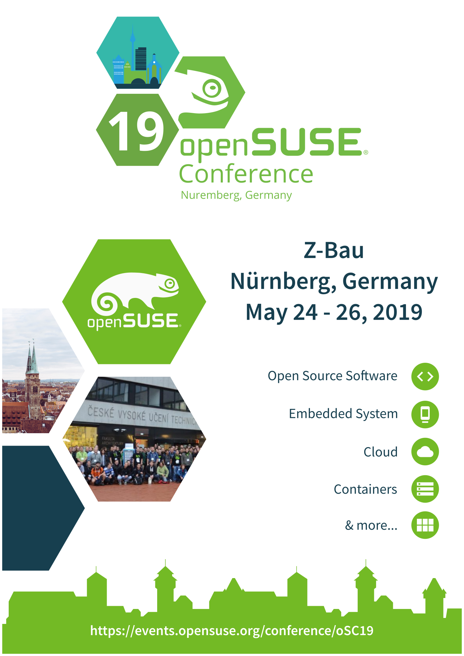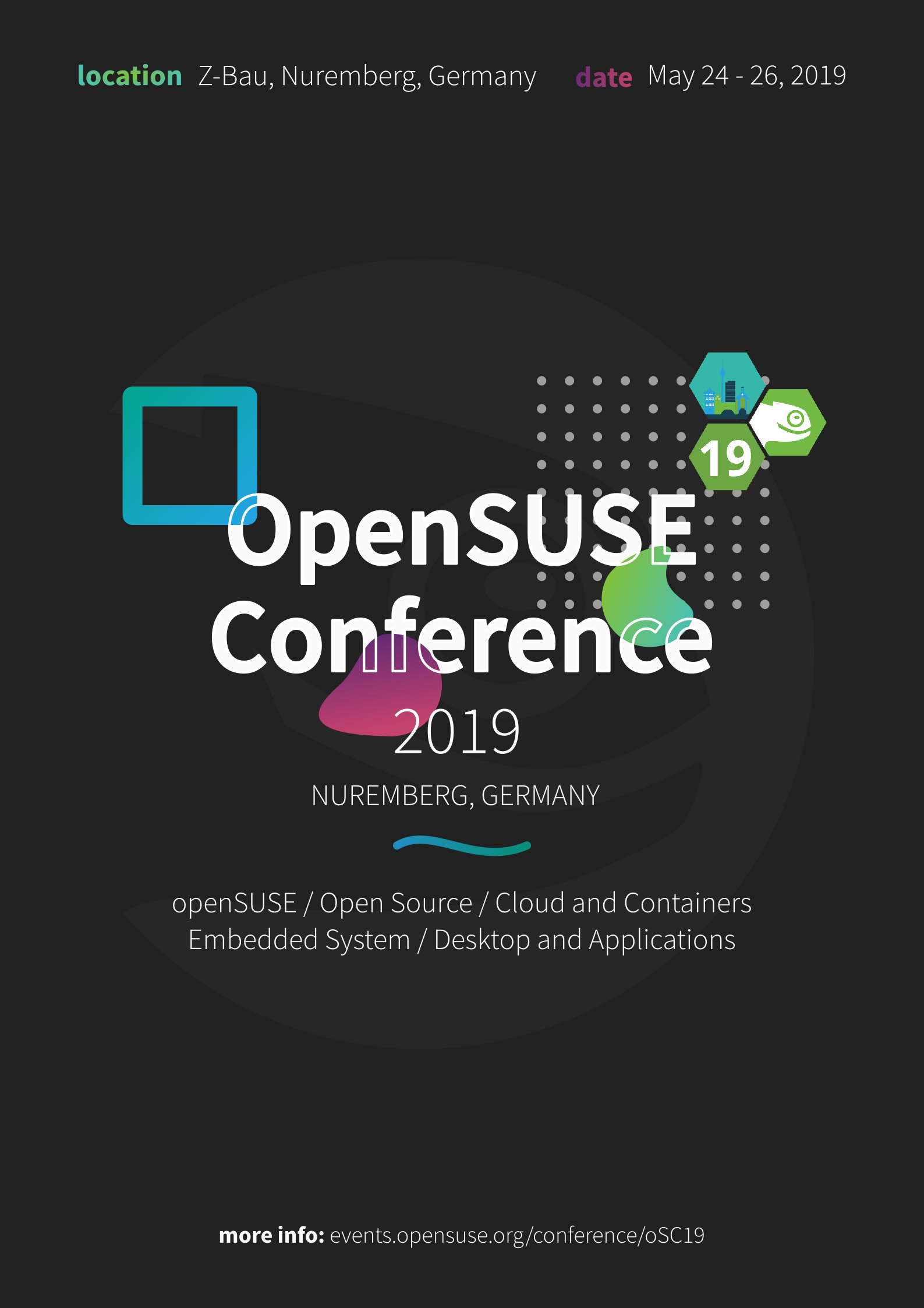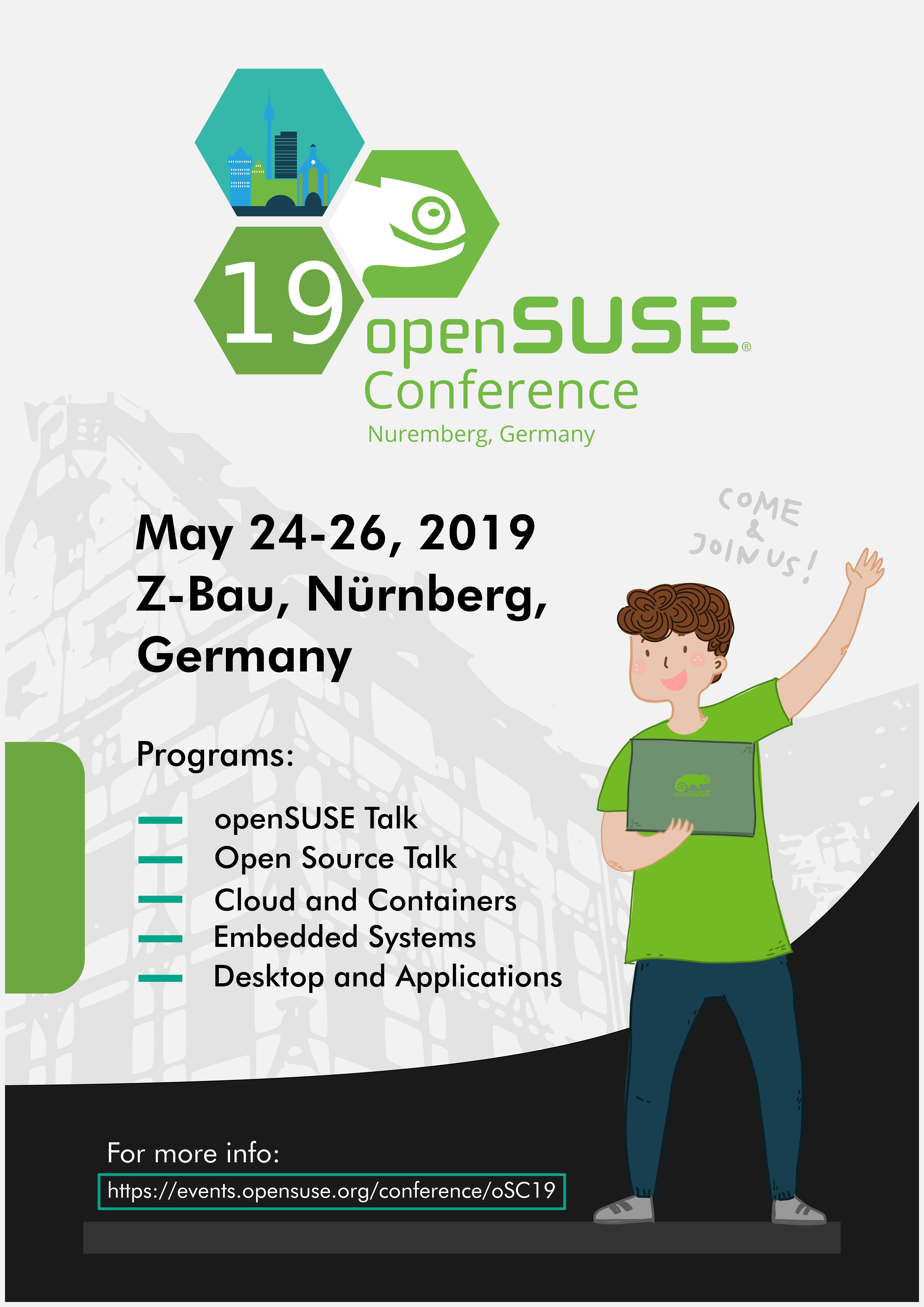 - 海报应包括 openSUSE 大会名称、日期(5 月 24 日至 26 日)以及大会地点(德国纽伦堡)。