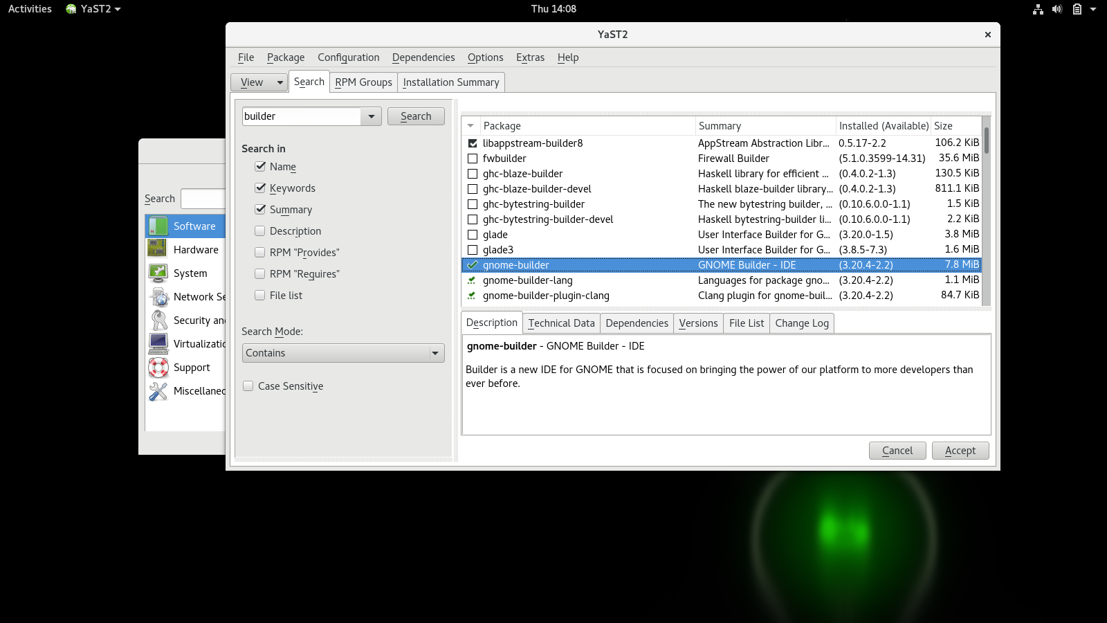 当安装过程中出现问题时,系统现在提供了启动调试器的可能性;具有 Ruby 知识的用户可以使用它来检查发生的情况,甚至可以解决问题。还有一些增强功能,包括安装程序内存使用量显著减少。键盘布局和控制台字体的选择和配置也已针对 systemd 进行了调整,以提高兼容性。可以在 上找到其他 YaST 改进。