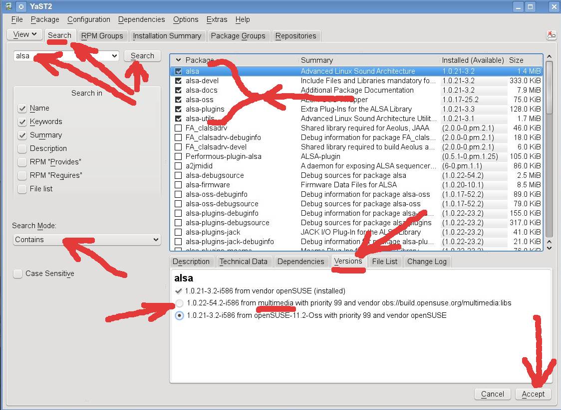 如上图左侧所示,转到 YaST > 软件 > 软件管理,选择“仓库”,然后在左侧选择仓库“multimedia”。确保选择“版本”选项卡,以便查看版本,然后选择更新您的 PC 的所有 alsa 应用程序,包括“libasound2”。不要添加新的 alsa 应用程序,只需更新您所有现有的 alsa 应用程序。请参阅左侧的示例。请注意,这只是一个示例,因为您可能安装了不同的 alsa 应用程序。