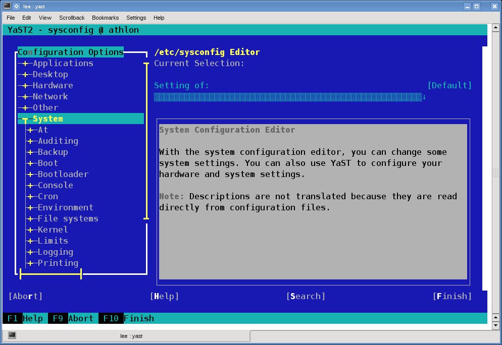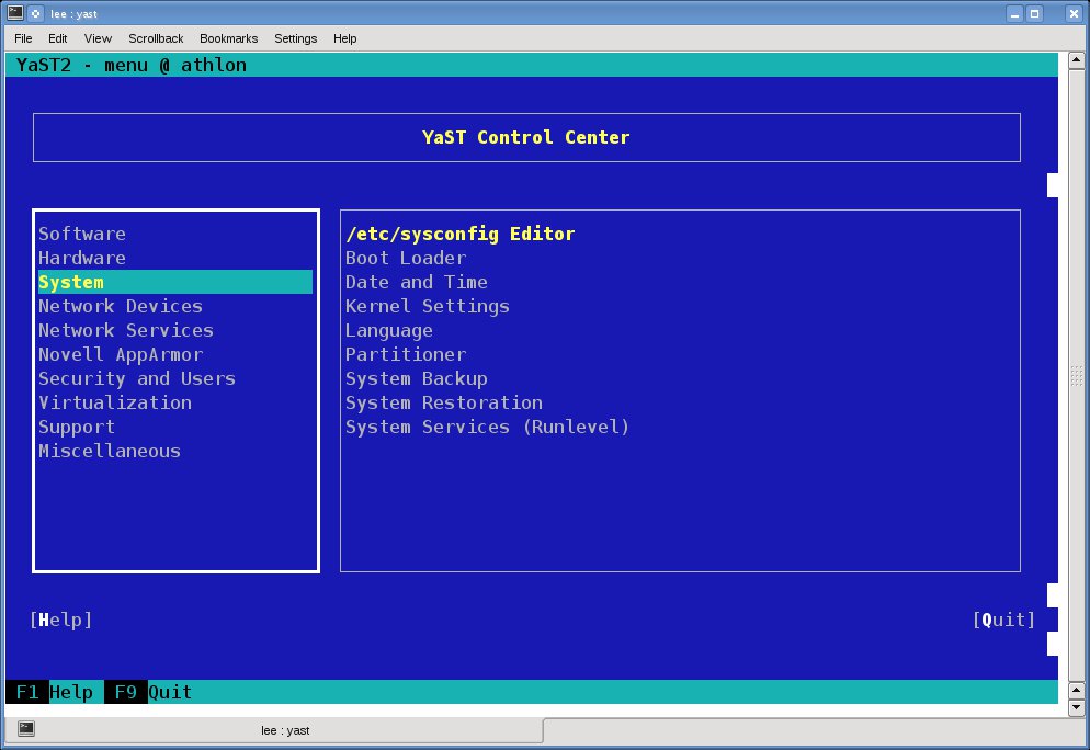 使用空格键、Tab 键、Enter 键和箭头键在文本模式下导航 yast,然后按照示例屏幕操作。