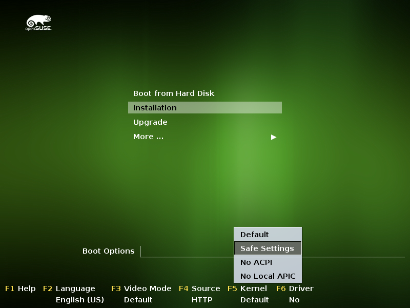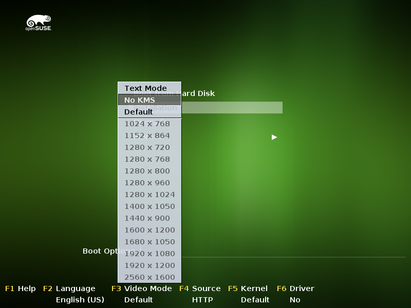 如果您在常规 BIOS 安装的 PC 上安装 openSUSE,请选择 F3 下的“无 KMS”菜单,这与 "nomodeset".