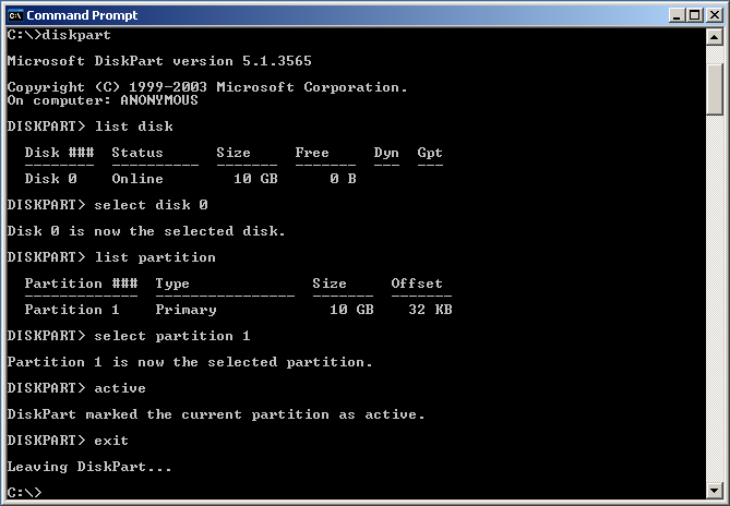 DISKPART> list partition «--- print partition table DISKPART> select partition 1 «--- select the first partition DISKPART> active «--- activate disk/partition (bootable) DISKPART> exit «--- exit