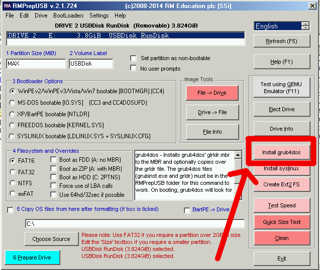 GRUB4DOS 可以使用 RMPrepUSB 安装