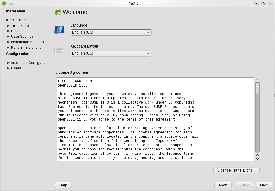 步骤 1:欢迎屏幕在页面顶部,您可以设置您的语言和键盘布局。设置语言后,YaST 将为您选择适用的键盘布局。但是,如果这不正确,您可以使用键盘布局下拉菜单进行更正。 在设置下方显示了最终用户许可协议 (eula)。要以其他语言查看许可协议,请单击 许可翻译。如果您接受许可协议,请单击 下一步。