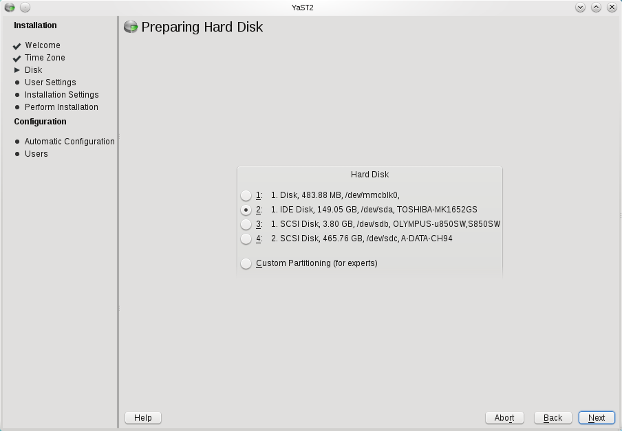 步骤 3:设置您的磁盘选择您要用于安装的硬盘。如果您在同一硬盘上安装了另一个操作系统(例如,Microsoft Windows 或另一个 Linux),YaST 将调整该操作系统的尺寸,以便它仍然在您的计算机上,但有足够的空间来安装 openSUSE 11.3。