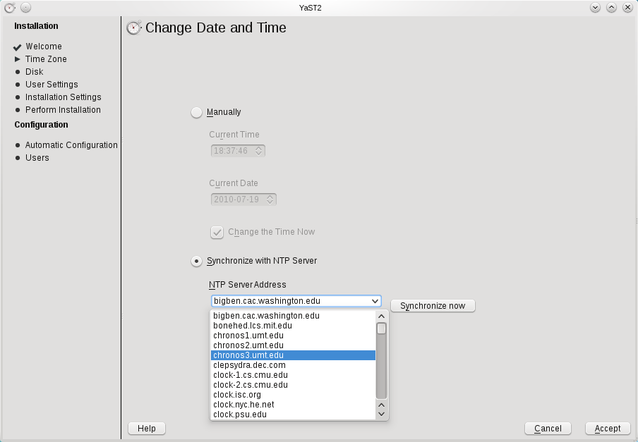 在时区下方显示当前设置的时间。如果时间不正确,或者您想设置时间服务器,请单击 更改。现在您可以手动更改时间,也可以选择 与 NTP 服务器同步,如果您想使用时间服务器的话。您可以从下拉菜单中选择一个时间服务器。单击 确定 时,时间将自动同步。 您必须具有正常工作的互联网连接才能设置时间服务器