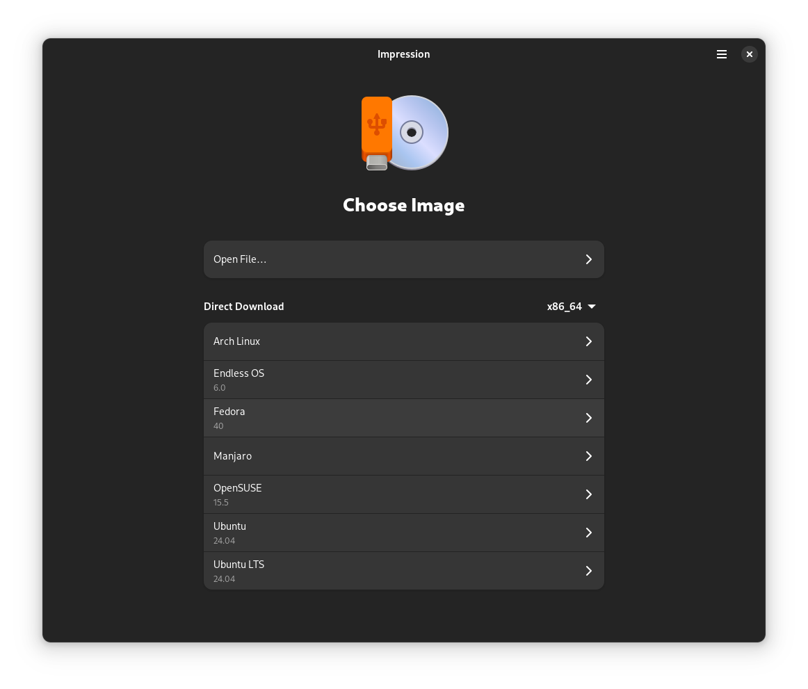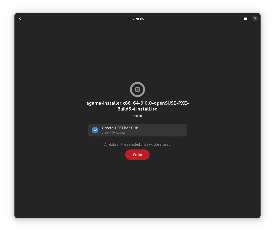 Impression 仅在 Tumbleweed 仓库中可用。 对于 Leap,请安装 Imagewriter 包。