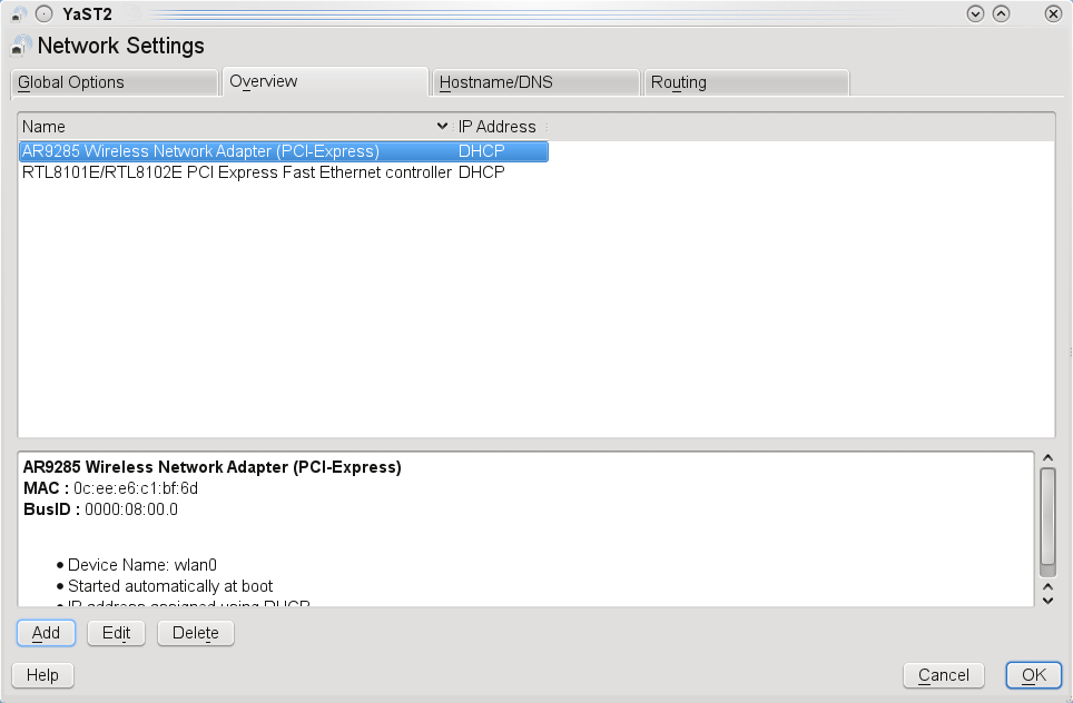 - 启动 YaST 的网络配置: 网络设备 → 网卡