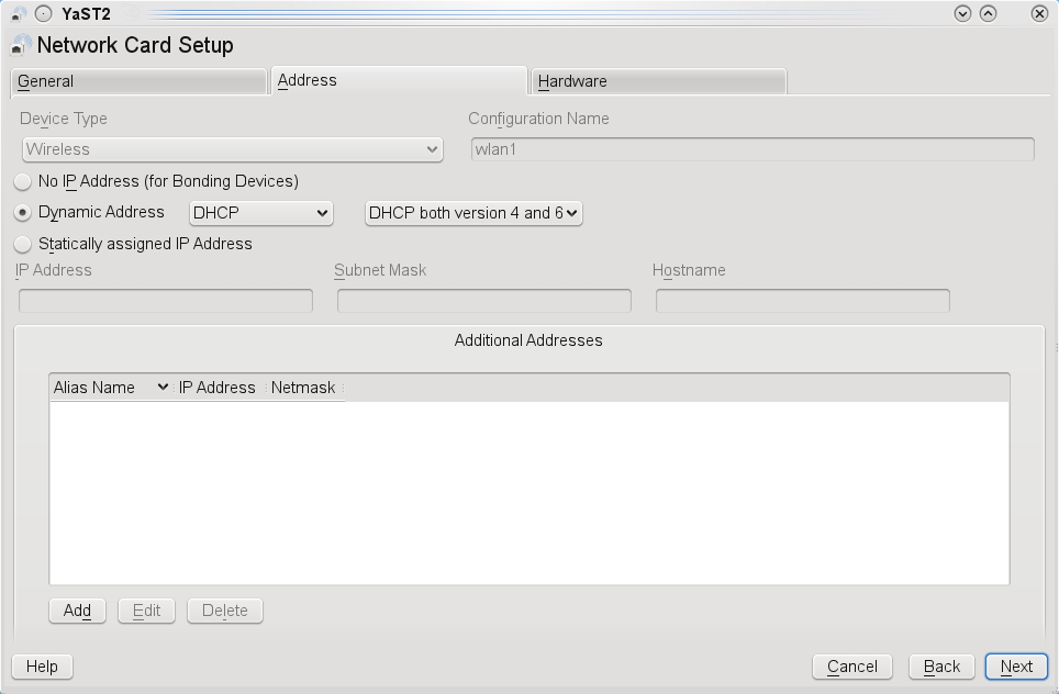 如果您无法使用 NetworkManager 连接到无线网络,您可以使用 ifup 配置无线连接(IP 地址、加密、身份验证等)通过 YaST。