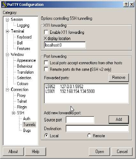 第一个连接会将您 PC 上的(本地)端口与服务器上的端口连接起来。服务器上的端口用于允许 VNC 连接到服务器,因此这将允许您通过加密、压缩的隧道登录到远程服务器!我们将使用的本地端口是 5952,我们将将其连接到服务器机器上的相同端口。为此,我们输入本地端口 5952。远程值是连接到隧道远程端的“machine:port”地址。注意:此处指定的地址用于隧道的远程侧,因此这里的 'localhost' 指的是服务器,而不是您的机器!localhost 的地址是 127.0.0.1,因此我们第一个连接的“远程”值是 127.0.0.1:5952。