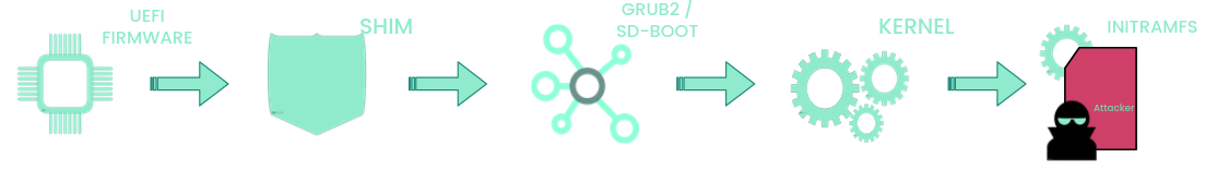 initramfs(或 initrd)是由 dracut(mkosi-initrd,...)生成的压缩归档文件。它包含挂载根文件系统所需的最小服务集,并且在这种情况下,initramfs 只能由生成它的系统使用。因此,由于在机器上本地构建,它不能由供应商签名。引导链并非完全安全,攻击者可以更改或破坏包含 initramfs 的 cpio 归档文件。