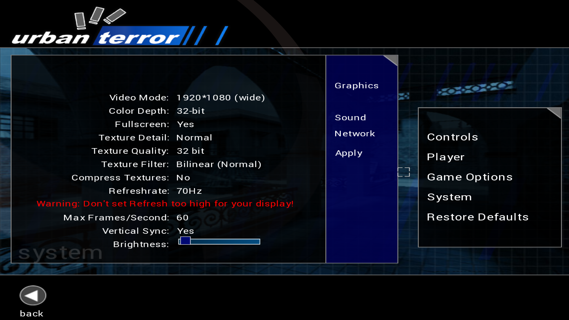 Urban Terror 在安装后带有默认按键分配。您可以通过导航到 SETUP -> CONTROLS 在用户界面中更改这些按键绑定,或者直接编辑您的配置文件。或者,如果您在游戏中并想调整控制,只需按下 ESCAPE 键并选择出现的 CONTROLS 选项即可。