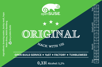 在 FOSDEM2016 上,openSUSE 啤酒将其 开放构建服务啤酒 标签更改为新的标签,突出显示了 openSUSE 的一些项目,例如 OBS、YaST、Factory 和 Tumbleweed。