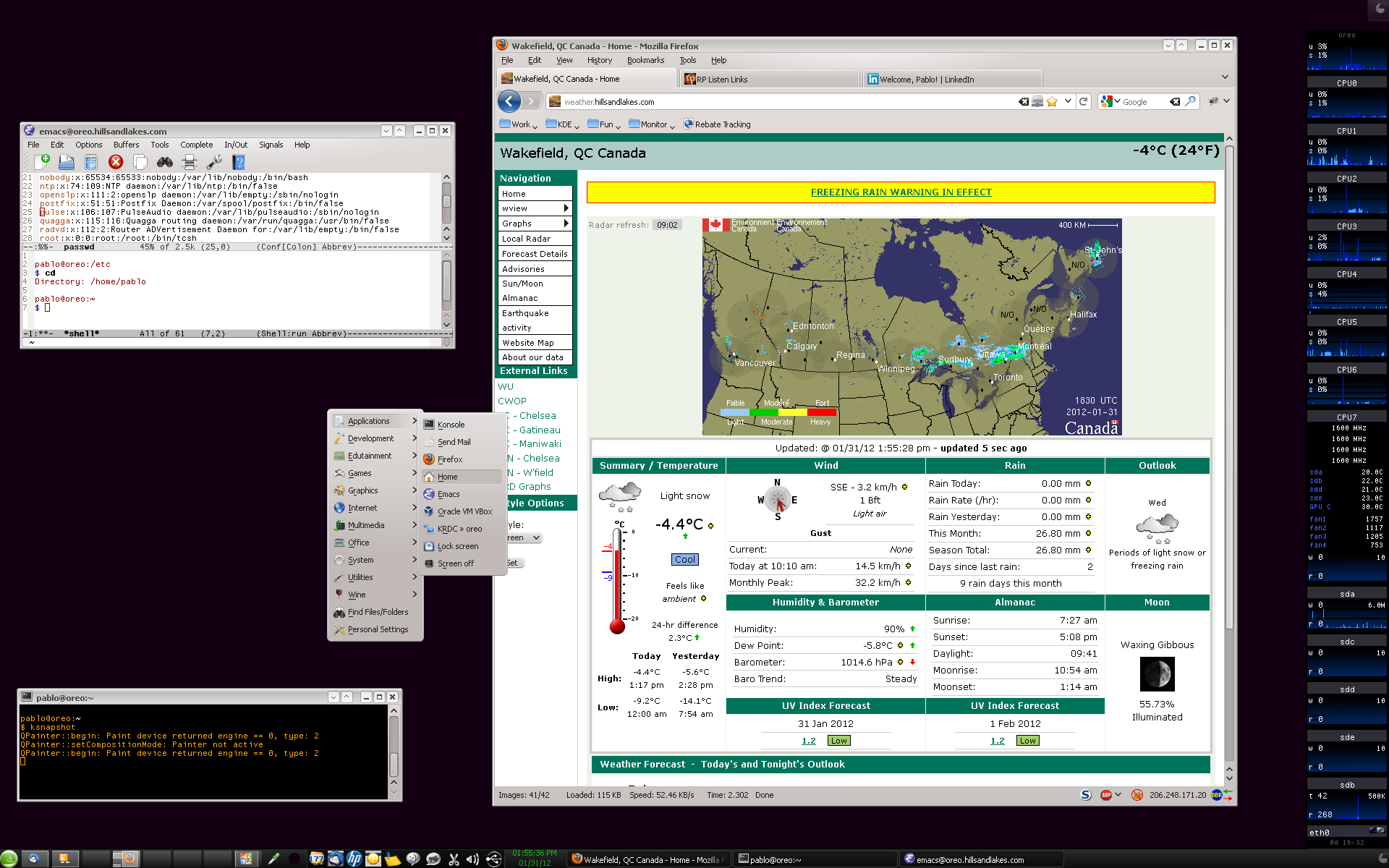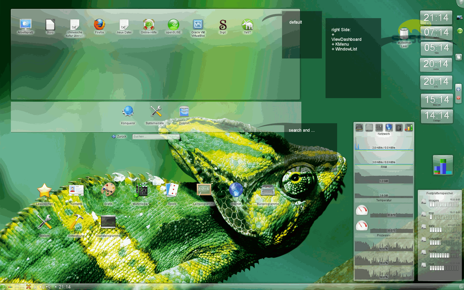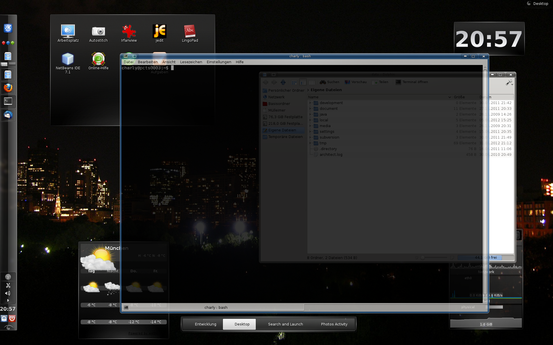 我经常有带有易于访问图标和应用程序启动器的多个面板。目前我没有使用额外的面板,因为我不太经常使用 Konqueror,但曾经当它拥有 wiki 上用于输入框的最复杂编辑器时,它总是存在。使用 Kate(编辑器)启动器,我仍然使用它,它需要比一个面板能够提供的更多空间。Rajko m 20:32, 27 February 2012 (MST) mxttie 的桌面 Opensuse 11.4 - KDE 4.6